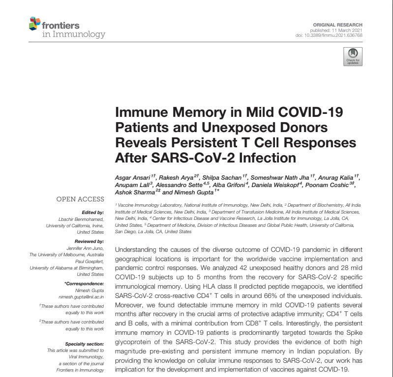 Understanding the T-cell immunity to SARS-CoV-2 infection and vaccination is important to develop effective pan-coronavirus vaccines. We reported within a few months of the pandemic that the Indian population seems to have high magnitude of the cross-reactive T cells that existed before COVID pandemic and may be generated due to exposure to common cold viruses. The high level of cross-reactive CD4+ T cells prior to SARS-CoV-2 infection perhaps explains the less severe disease and lower rates of hospitalization in India (Frontiers Immunology, 2021). We are now conducting detailed investigations on the T cells in individuals who recovered from COVID-19 (Asymptomatic and mild) and received vaccination.