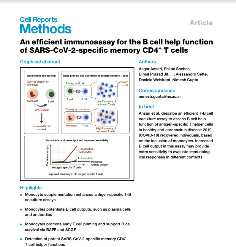There are several limitations in studying the human immune system. Particularly, the sample volume used to be a major limitation for performing multiple cellular analyses at the antigen-specific levels. Therefore, we continue to attempt on developing the immunological tools that can help us to examine the biology of antigen-specific T cells. In the similar efforts, we have recently described a highly sensitive and efficient T-cell assay that can measure the B cell help function of memory CD4 + T cells, with as few as ∼90 T cells. We have also provided mechanistic details of this enhanced method, which will be helpful in the widespread use of this assay in various vaccine and infection models including COVID-19 vaccines, Mycobacterium tuberculosis, Dengue etc. (Cell Reports Methods, 2022, Indian Patent). Utilizing this assay, we are now dissecting the crucial determinants of the productive cross-talk between T cells and B cells. We believe that the efforts will open up new avenues of research in the area of T-cell and B-cell collaboration.