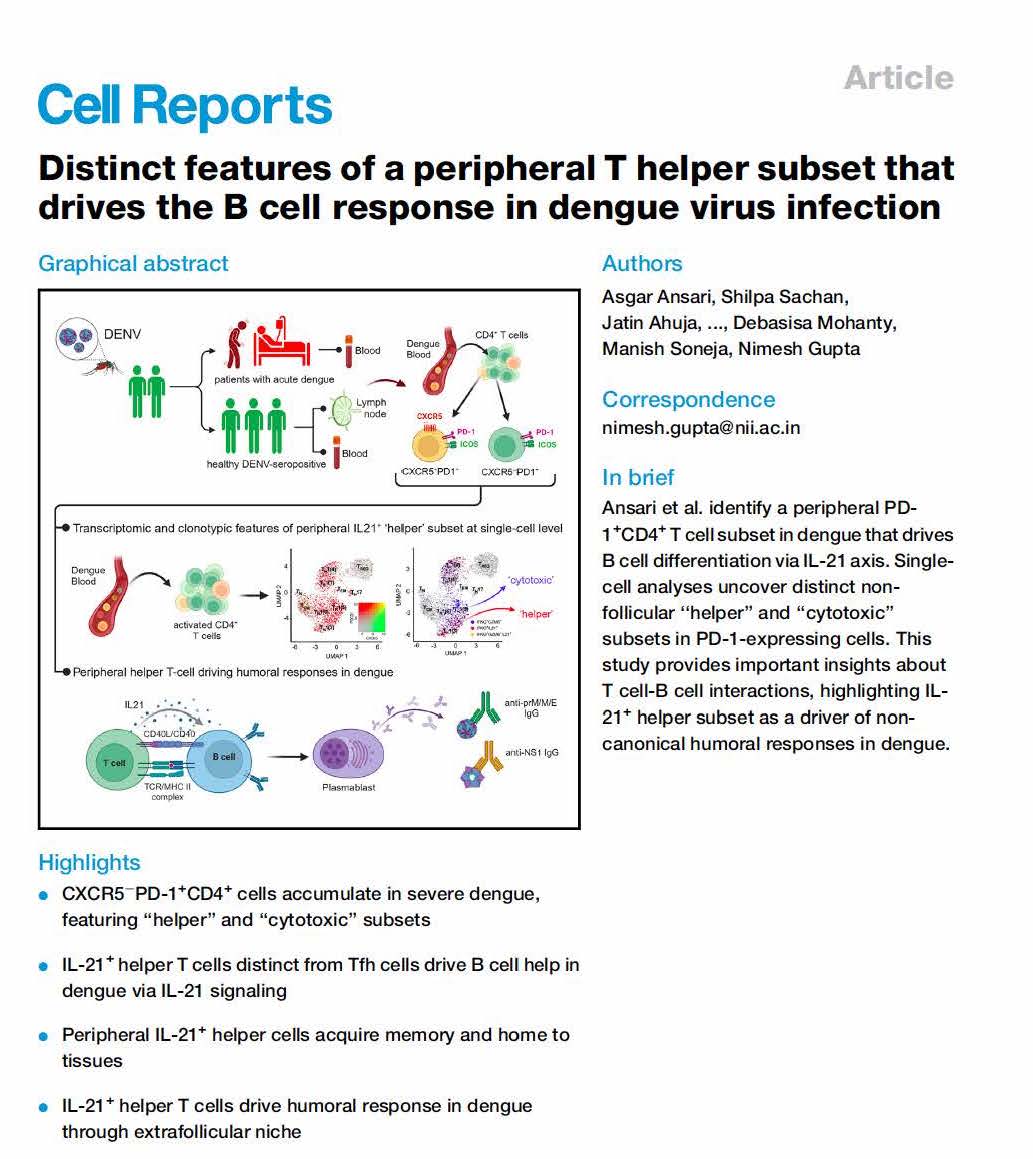 In this program, our attempts are focused on understanding the contribution of Tfh cells and related subsets in driving the B cell output and antibody response in dengue. Dengue is an interesting model to understand the T-cell determinants of humoral immunity development. We are exploring the biology of Tfh-cell and related T-cell subsets in various outcomes of the dengue virus infection. Our current report from the patient cohort provides an insight into the cellular basis of antibody responses to dengue virus. We provide the first evidence of a peripheral T helper subset that showed the phenotypic resemblance to Tfh cells, and also the traits of help to B cells. We have developed a highly efficient antigen- specific T-B co-culture assay for measuring the T-dependent B cell responses, which work with as low as ~90 Ag-specific T cells (Cell Report Methods, 2022). We found that the novel Th-subset can provide help to B cells, has the potential of driving plasmablasts differentiation and induce the IgG production, as efficiently as the bonafide Tfh subset. We further observed that the novel Th-subset can induce productive cross-talk with both the naïve and memory B cells. We are now progressing to understand the transcriptomics landscape and the clonotype diversity of this newly identified CD4 + T cell subset at the single cell level, using 10X genomics platform. We also intend to develop a transgenic mouse model to further explore the origin of this novel subset.
